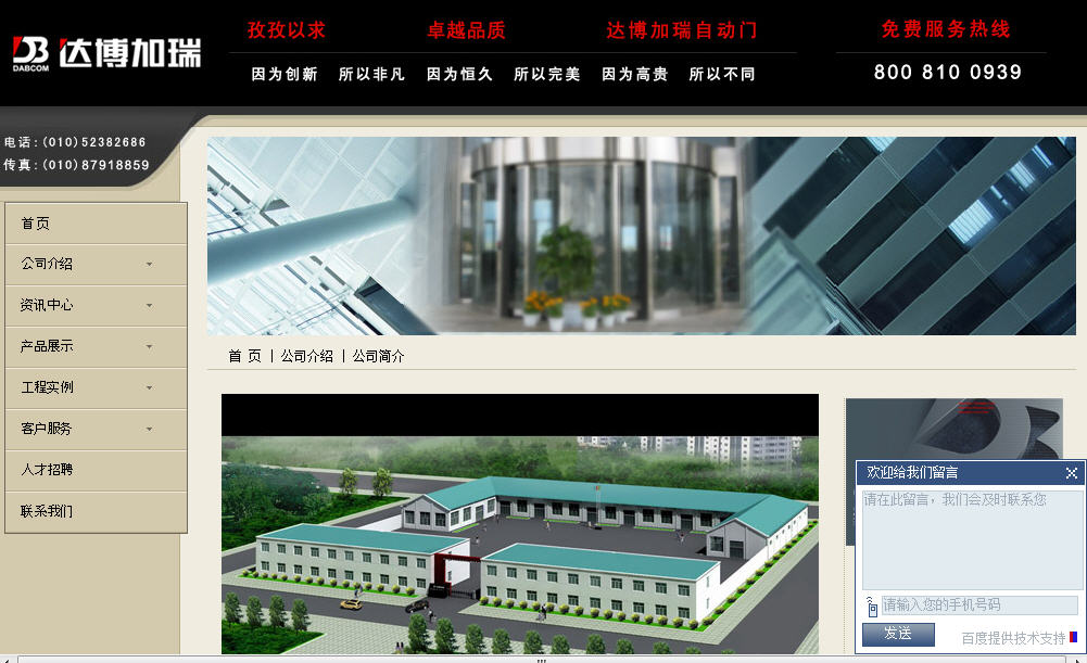 公司始創(chuàng)于1993年3月,前稱為“北京瑞康自動門公司”,在整合著名自動門公司及專業(yè)建筑自動化產(chǎn)品后,由北京有色金屬總公司與加拿大加瑞國際工程公司共同出資,在中國北京注冊了高新技術中外合資企業(yè)—北京達博加瑞建筑自動化系統(tǒng)有限公司,專業(yè)從事自動門、自動旋轉(zhuǎn)門、智能門禁系統(tǒng)的生產(chǎn)制造及技術開發(fā)。