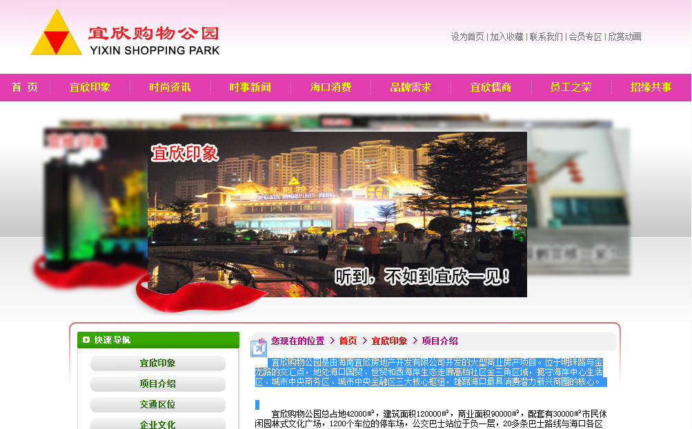 宜欣購物公園是由海南宜欣房地產(chǎn)開發(fā)有限公司開發(fā)的大型商業(yè)房產(chǎn)項目。位于明珠路與金龍路的交匯點,地處??趪Q、世貿和西海岸生態(tài)走廊高檔社區(qū)金三角區(qū)域,扼守海岸中心生活區(qū)、城市中央商務區(qū)、城市中央金融區(qū)三大核心樞紐,雄踞??谧罹呦M潛力新興商圈的核心。